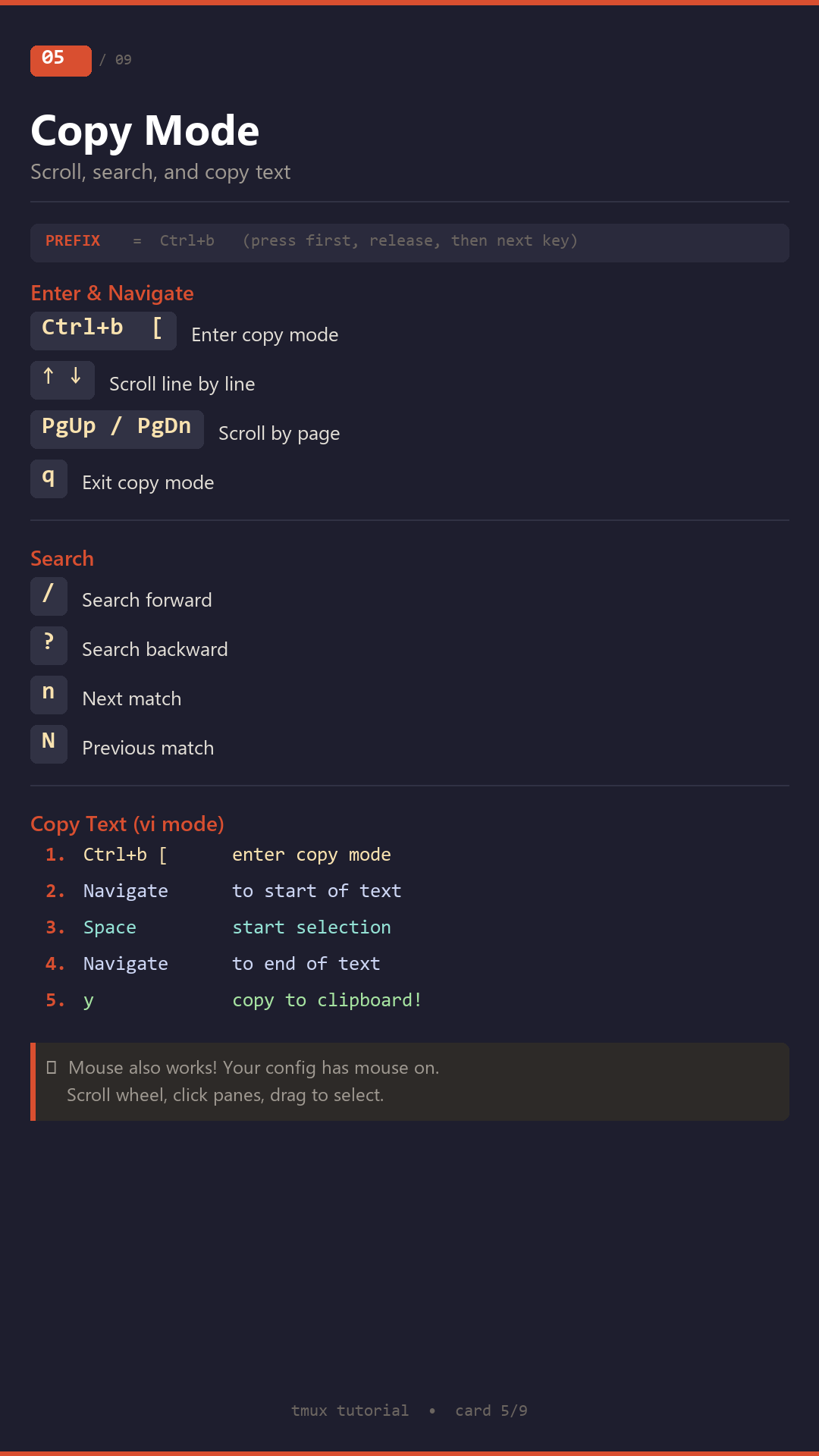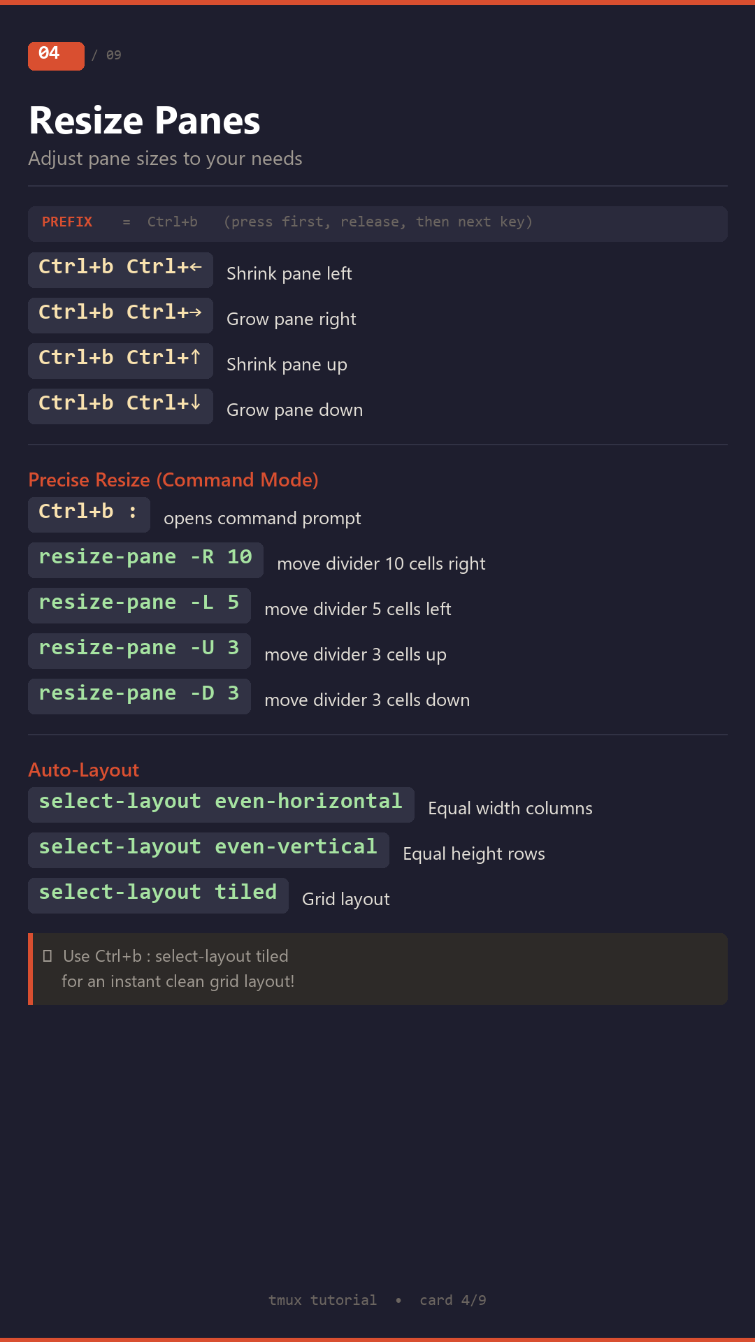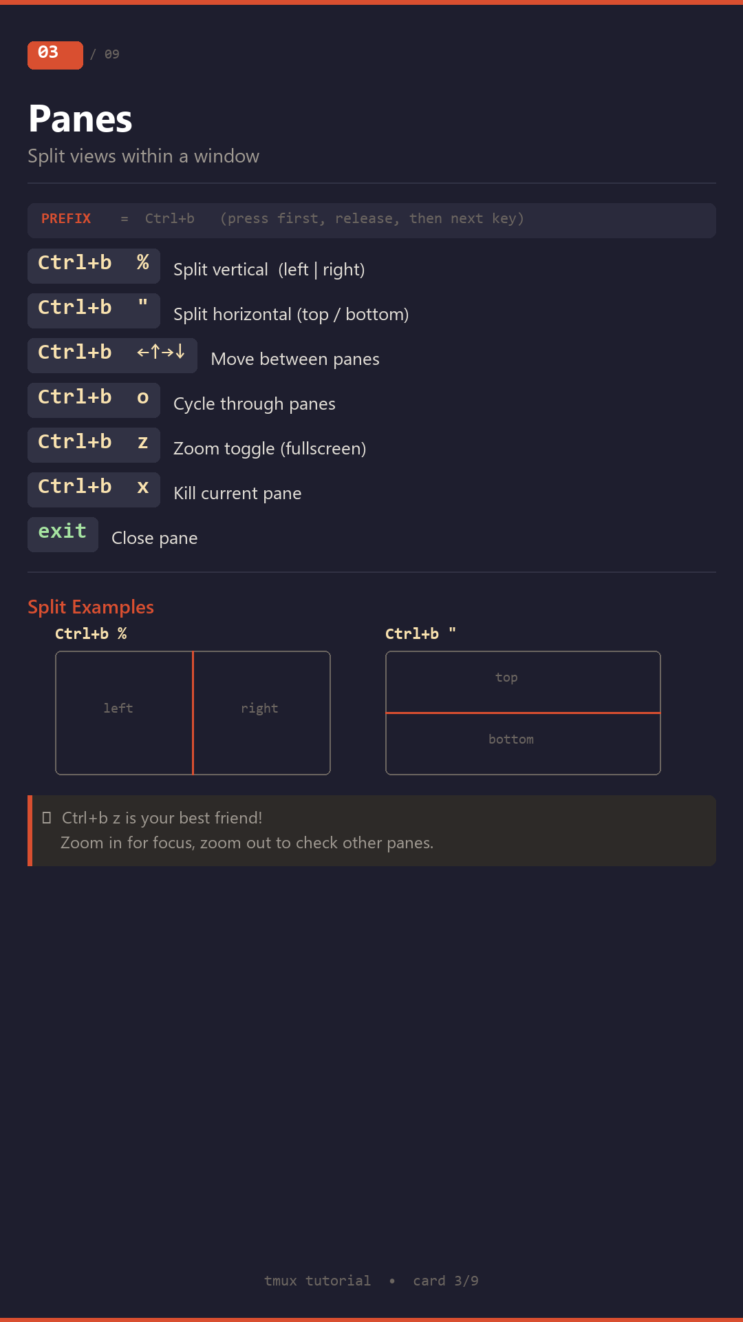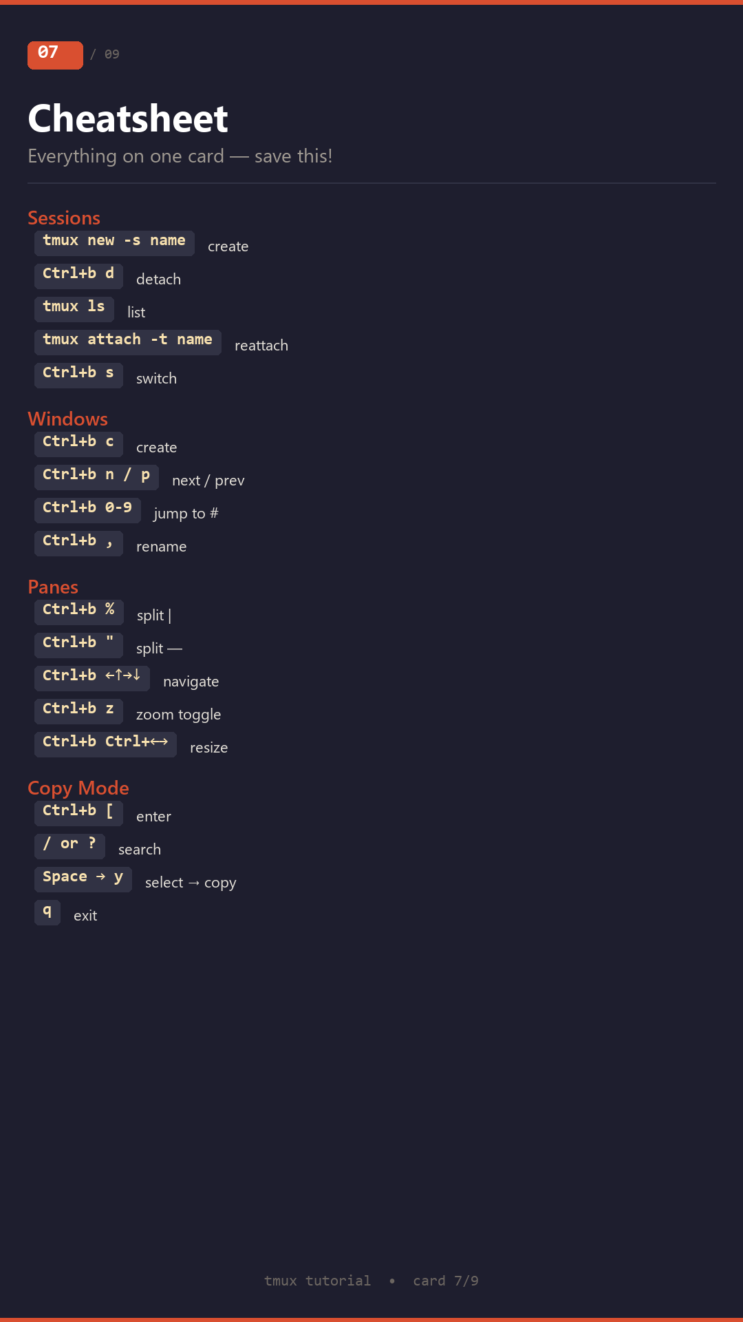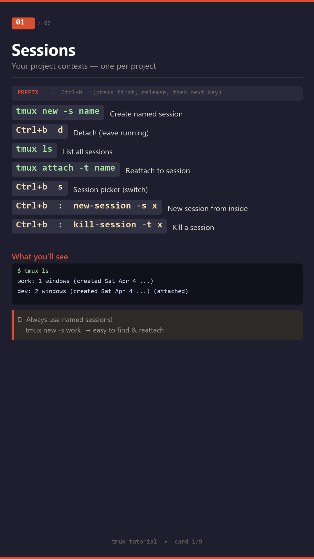 Interactive tmux tutorial with hands-on exercises, PNG training cards, and completion certificate.