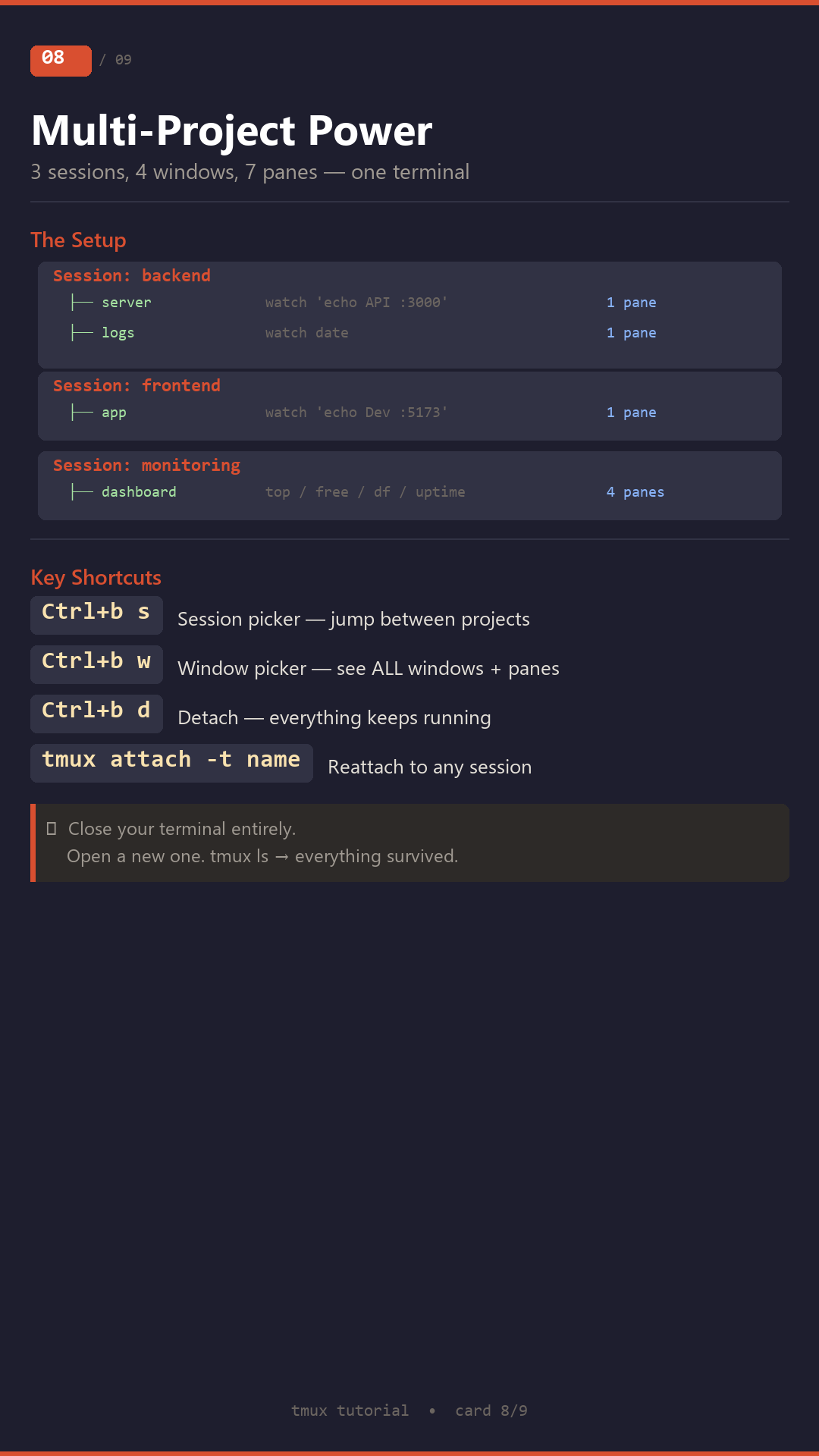 An interactive, hands-on tutorial for learning tmux β the terminal multiplexer that every developer should know but few take the time to learn properly.